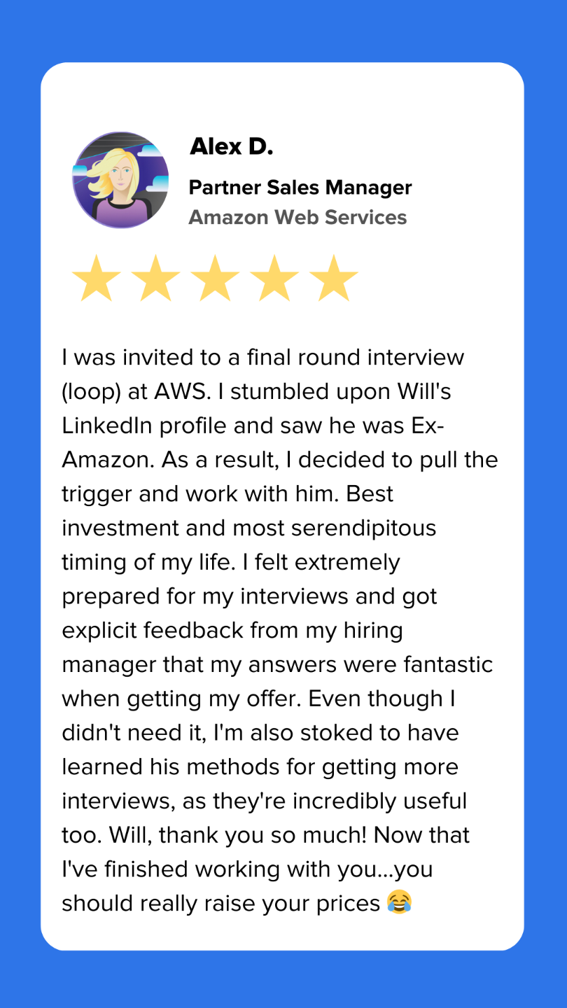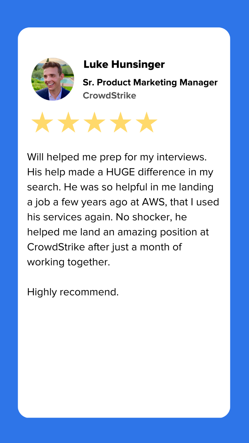 Over the years, I've helped 500+ customers land job offers across every core business function at companies including: Google, Apple, Amazon, Nike, Disney, P&G, Goldman Sachs, Deloitte, Microsoft, Walmart, and more!