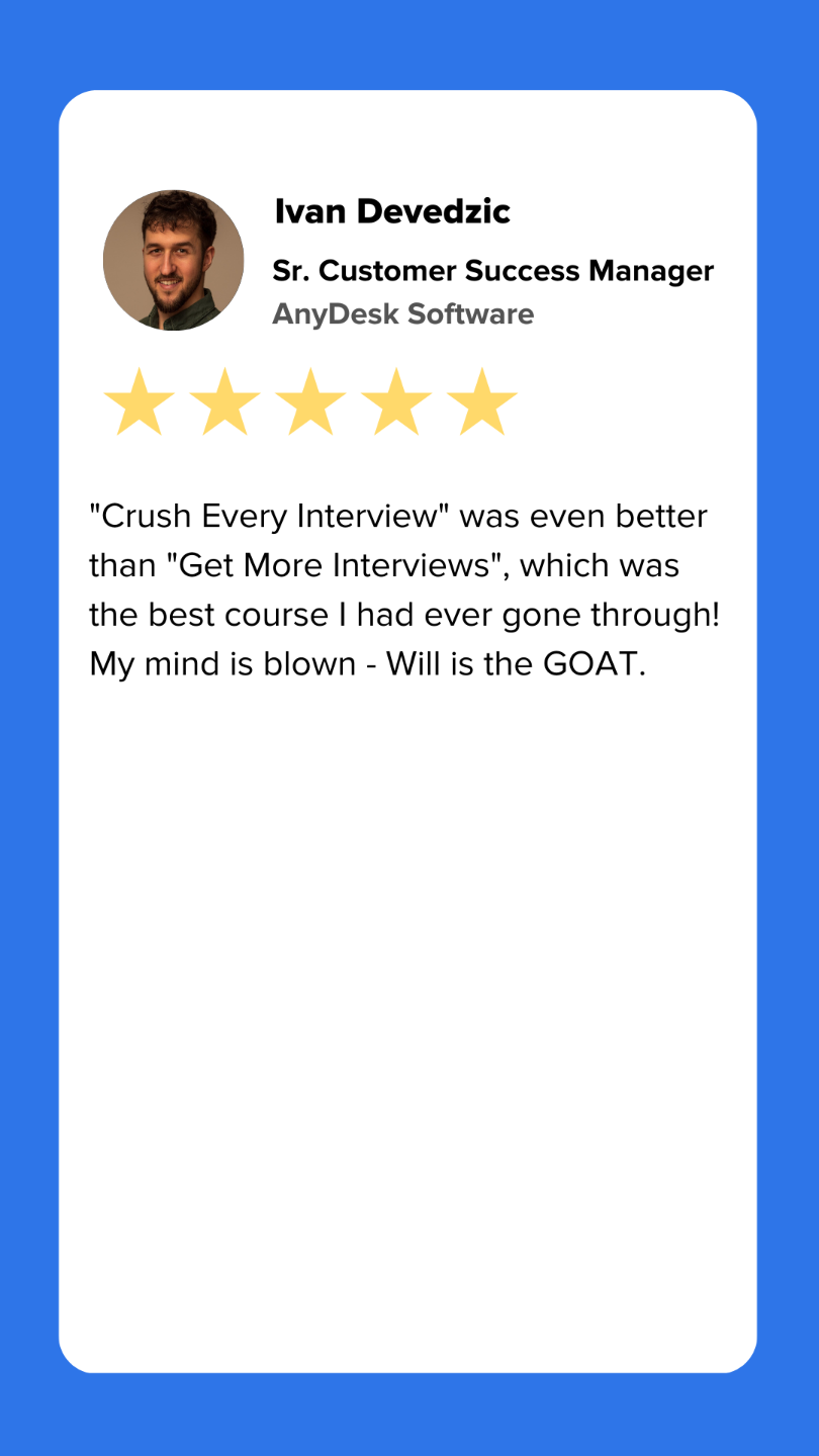 You'll receive video trainings, guides, templates, and best-in-class examples for every type of interview question and learn how to expertly answer them all.